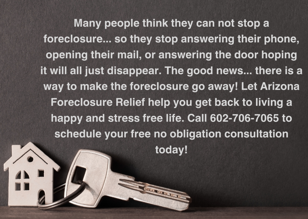 In most cases, once foreclosure has started, you have been through several months of late payments or no payments. These late payments have a devastating effect on your credit rating, which in most cases will lead to a denial of the refinance loan application. If you are approved it will probably be at a VERY high interest rate with high closing costs. If you are seriously considering this option then call 602-706-7065. We have connections with companies that could help you. Remember that time is of the essence so don’t waste valuable time on this option or you could lose your home while waiting on loan approvals.